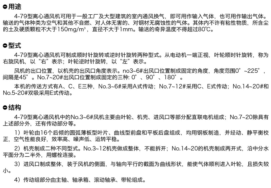 4-79型離心通風(fēng)機(jī)可用于一般工廠及大型建筑的室內(nèi)通風(fēng)換氣,即可用作輸入氣體,也可用作輸出氣體。 輸送的氣體種類為空氣和其他不自燃、對人體無害的、對鋼材無腐蝕性的氣體。 其體內(nèi)不許有粘性物質(zhì),所含塵 的土及硬質(zhì)顆粒不大于150mg/m3,直徑不大于1mm。 輸送的奇異溫度不得超過80°C。