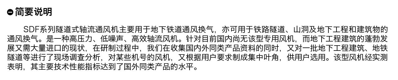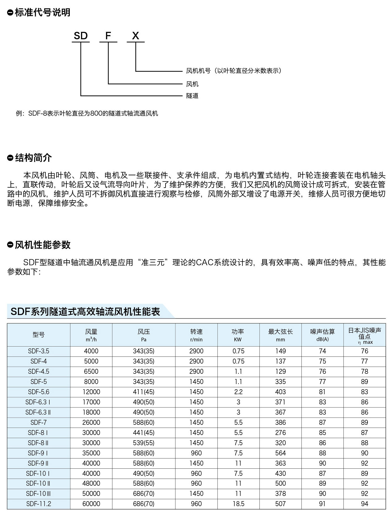 SDF系列隧道式軸流通風(fēng)機主要用于地下鐵道通風(fēng)換氣,亦可用于鐵路隧道、山洞及地下工程和建筑物的 通風(fēng)換氣。 是一種高壓力、低噪聲、高效軸流風(fēng)機。 該型風(fēng)機經(jīng)實測 表明,其主要技術(shù)性能指標(biāo)達到了國外同類產(chǎn)品的水平。