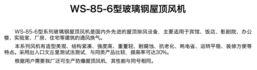 WS-85-6型系列玻璃鋼屋頂風機是國內(nèi)外先進的屋頂排風設(shè)備,主要適用于賓館、飯店、影劇院、辦公 樓、實驗室、廠房、住宅等建筑的通風換氣。 本系列風機有造型美觀、結(jié)構(gòu)緊湊、強度高、重量輕、耐腐蝕、抗老化、耗電省、運轉(zhuǎn)平穩(wěn)、裝修方便等 特點。 采用出入口文丘里測試法測試,與同類產(chǎn)品比較,提高率可達30%。 根據(jù)用戶黑要我廠還可生產(chǎn)防爆屋頂風機,其性能與同號相同。